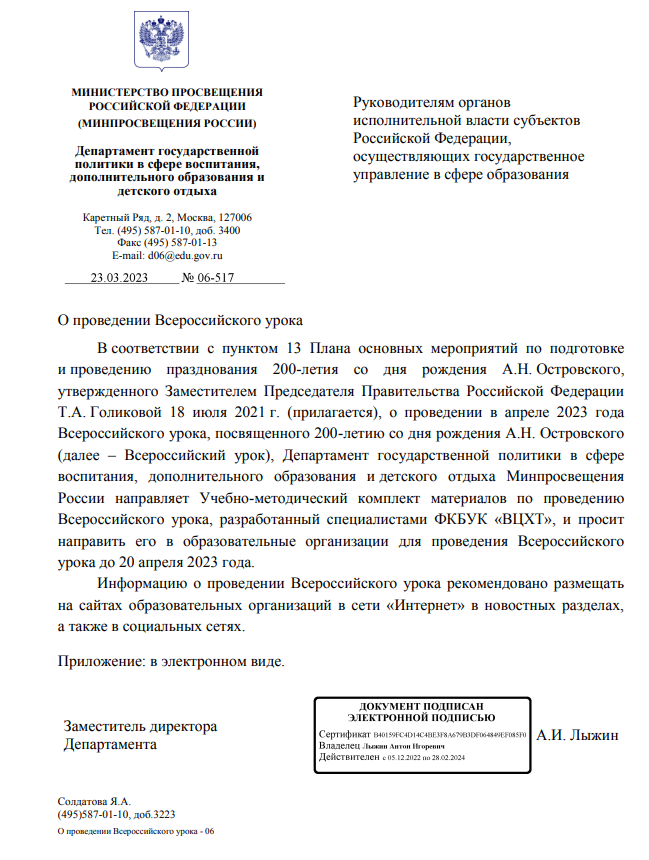 О проведении Всероссийского урока 200-летия со дня рождения А.Н.Островского Методические рекомендации 200-летие со дня рождения А.Н.Островского для обучающихся 8-11 классов, СПО «Александр Николаевич Островский-Хозяин Русской Сцены»Скачать План основных мероприятиях по подготовке и проведению 200-летия со дня рождения А.Н.ОстровскогоСкачать Сценарий занятия 200-летие со дня рождения А.Н.Островского для обучающихся 8-11 классов, СПО «Александр Николаевич Островский — Хозяин Русской Сцены»Скачать