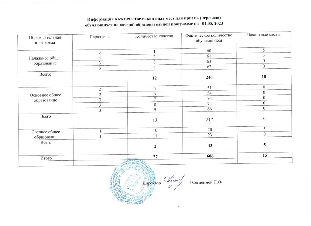 Вакантные места для приема (перевода) обучающихся